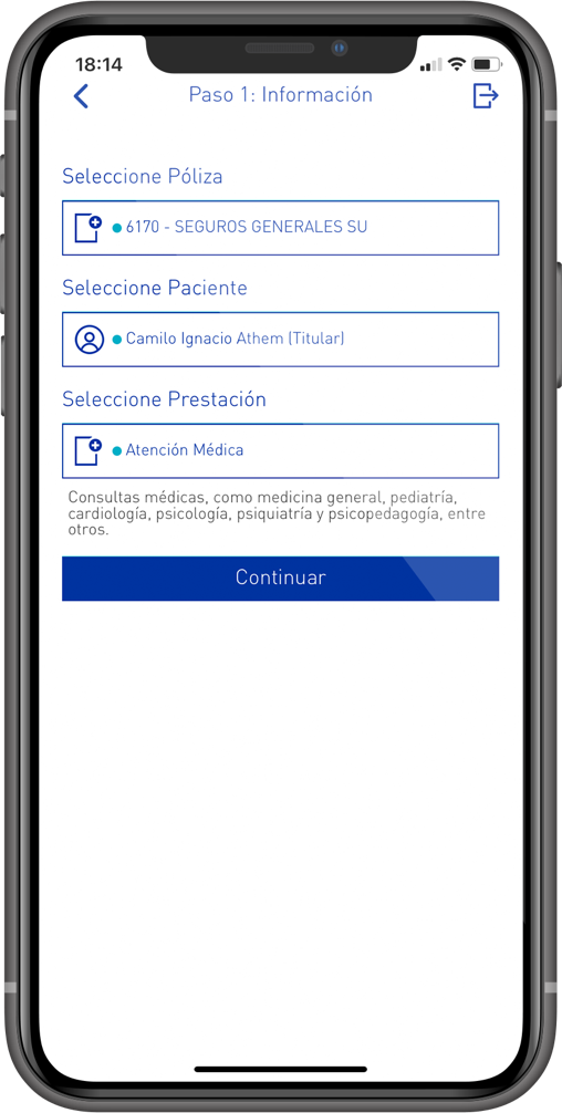 En el primer paso debes seleccionar la póliza, el nombre del paciente y la prestación. Luego ingresa el monto solicitado y presiona el botón Continuar.